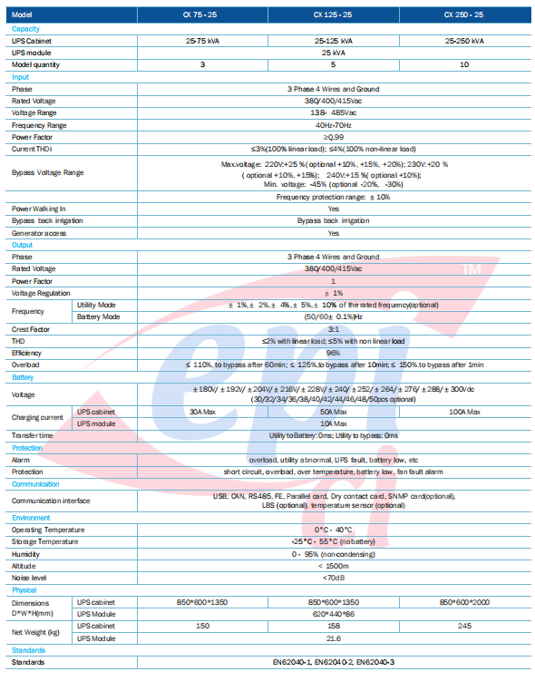 CX 25-250kVA is a modular design UPS. It uses on line double conversion and advanced DSP digital control technology, resulting in the highest levels of phase in, three phase out, with each module is 25kVA. It’s available from 25kVA to 250kVA unit capacity, and parallel 4 units to 1000kVA.